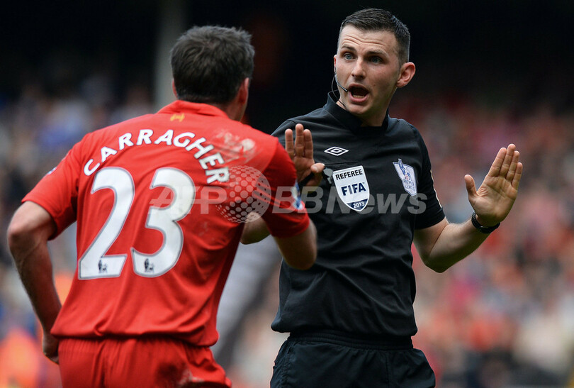 主審に抗議するリバプールのジェイミー・キャラガー(Jamie Carragher、左、2013年5月5日撮影)。(c)AFP/PAUL ELLIS