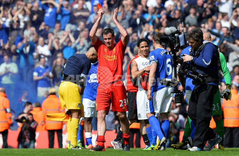 自身にとってキャリア最後のマージーサイドダービーを終え、観客の声援に応えるリバプールのジェイミー・キャラガー(Jamie Carragher、2013年5月5日撮影)。(c)AFP/PAUL ELLIS