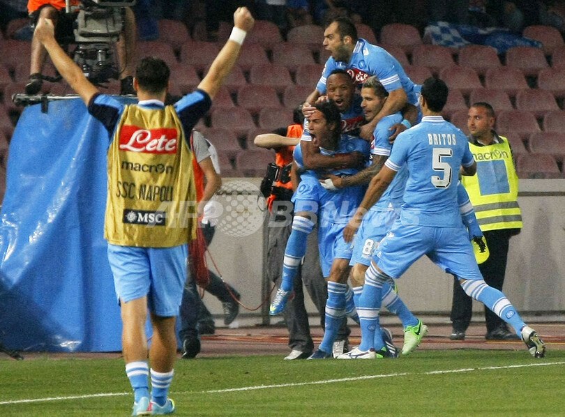 エディンソン・カヴァーニ(Edinson Cavani)の得点に歓喜するナポリの選手(2013年5月5日撮影)。(c)AFP/CARLO HERMANN