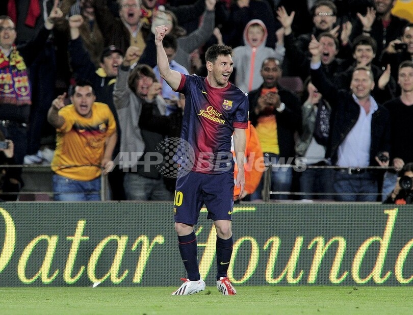 得点を挙げ喜ぶFCバルセロナのリオネル・メッシ(Lionel Messi、2013年5月5日撮影)。(c)AFP/JOSEP LAGO