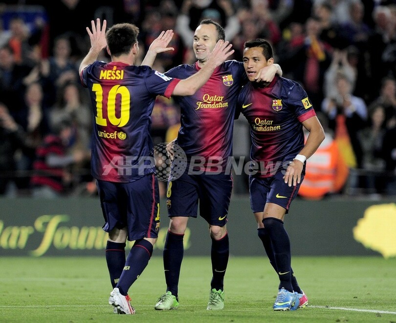 しかし、後半11分にダビド・ビジャ(David Villa)が得点しスコアを2-2とすると、ベンチスタートだったメッシがピッチに入ってわずか3分後の後半15分、フリーキックから見事なシュートを決めて逆転。そして同26分にはアンドレス・イニエスタ(Andres Iniesta)とサンチェスによる流動的なパスワークから、再びメッシがゴールに蹴り込んで、バルサの勝利を決定づけた。(c)AFP