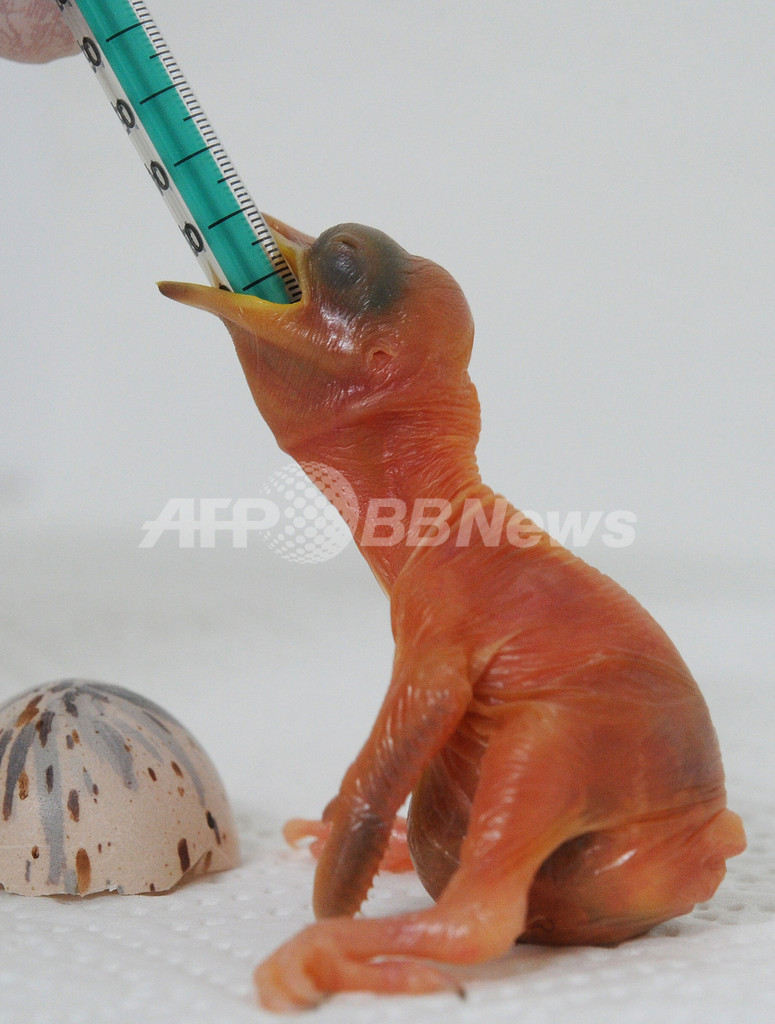 【5月5日 AFP】ドイツ北部バルスローデ(Walsrode)にある鳥類園で、スポイトから液体を与えてもらっているジュウニセンフウチョウのひな。卵からかえってわずか5日目だ。