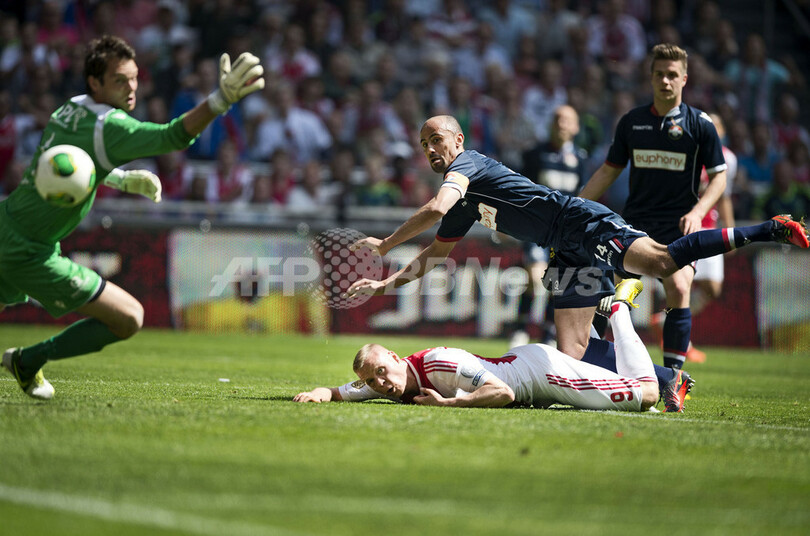 前半12分に先制点を決めるアヤックスのコルベイン・シグソールソン(Kolbeinn Sigthorsson、中央下、2013年5月5日撮影)。(c)AFP/ANP/OLAF KRAAK