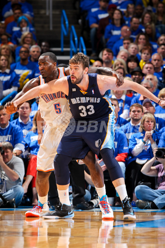ポジションを争うオクラホマシティ・サンダーのケンドリック・パーキンス(Kendrick Perkins、奥)とメンフィス・グリズリーズのマルク・ガソル(Marc Gasol、2013年5月5日撮影)。(c)AFP/Getty Images/NBAE/Joe Murphy