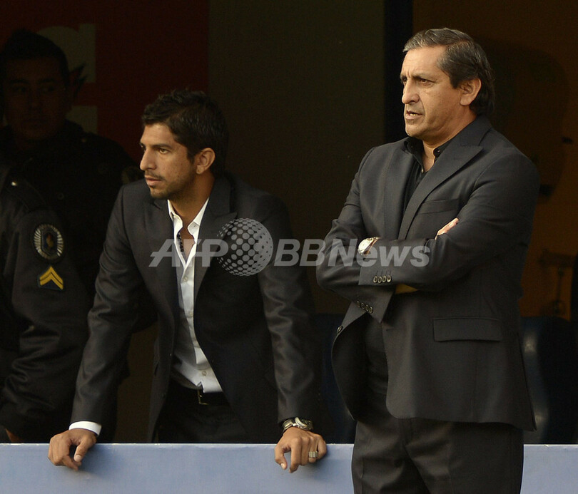 息子のエミリアーノ(Emiliano Diaz、左)氏と戦況を見つめるリーベル・プレートのラモン・ディアス(Ramon Diaz)監督(2013年5月5日撮影)。(c)AFP/Juan Mabromata