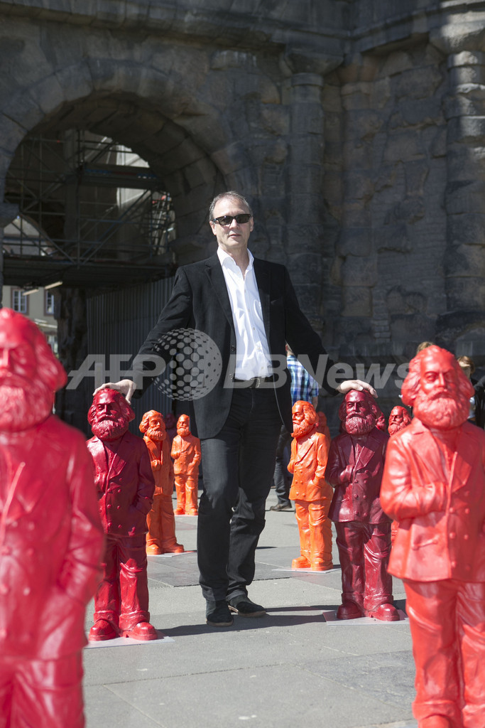 写真はマルクス人形とポーズをとる作家(2013年5月5日撮影)。(c)AFP/THOMAS WIECK