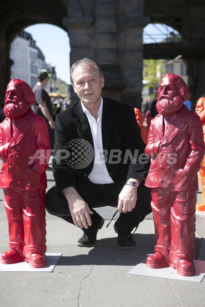写真はマルクス人形とポーズをとる作家(2013年5月5日撮影)。(c)AFP/THOMAS WIECK