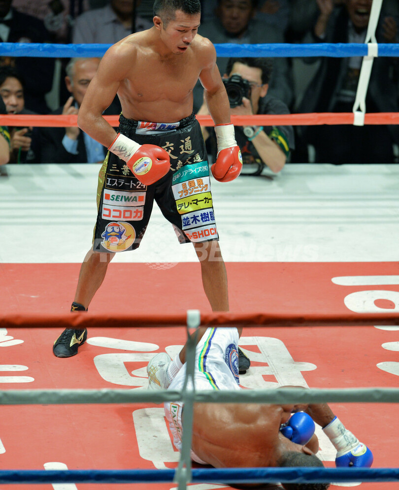 5回にハイデル・パーラ(下)からダウンを奪う内山高志(2013年5月6日撮影)。(c)AFP/KAZUHIRO NOGI