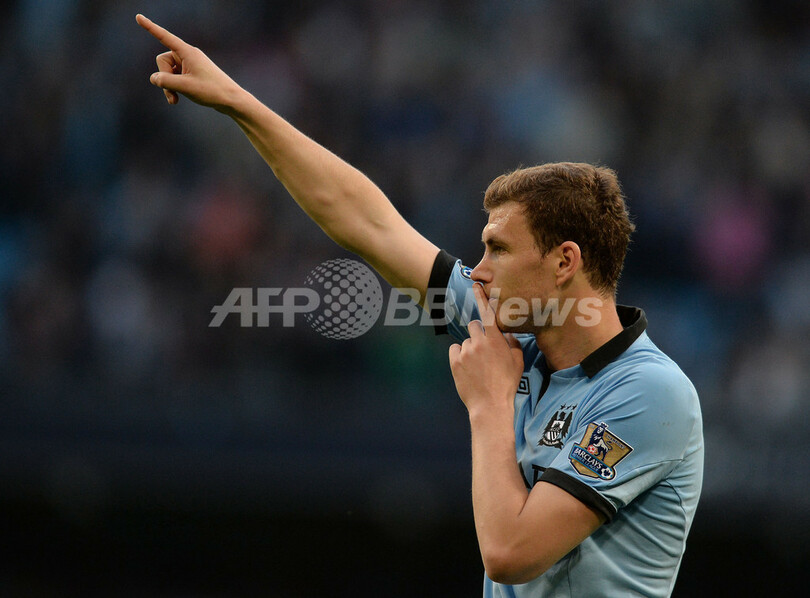 得点を決め喜ぶマンチェスター・シティのエディン・ジェコ(Edin Dzeko、2013年5月7日撮影)。(c)AFP/ANDREW YATES