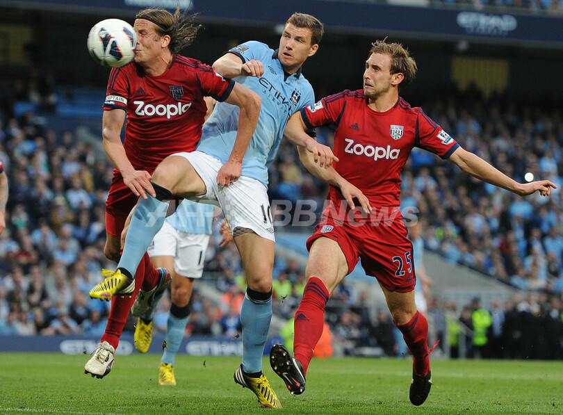 WBAのヨナス・オルセン(Jonas Olsson、左)、クレイグ・ドーソン(Craig Dawson、右)とボールを競るマンチェスター・シティのエディン・ジェコ(Edin Dzeko、2013年5月7日撮影)。(c)AFP/ANDREW YATES