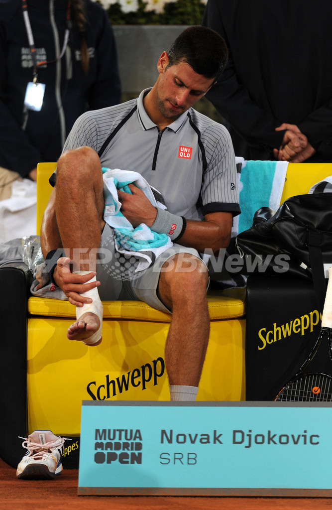 足首を気にするノバク・ジョコビッチ(2013年5月7日撮影)。(c)AFP/DOMINIQUE FAGET