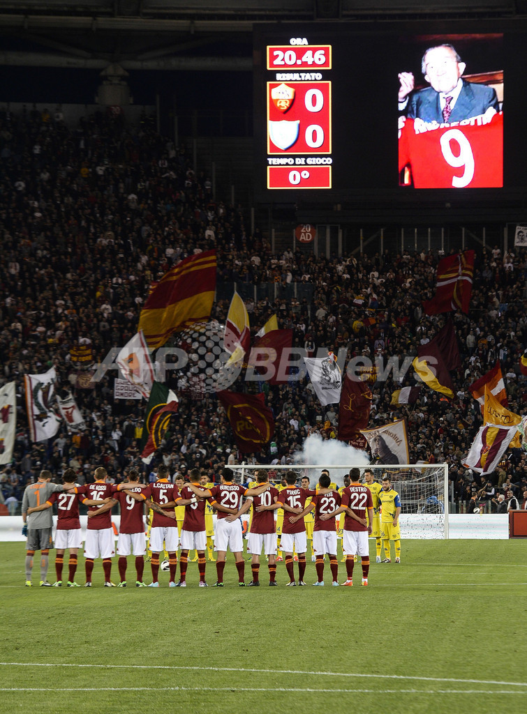 6日に死去したジュリオ・アンドレオッティ(Giulio Andreotti)元首相を悼み、1分間の黙とうをささげる両チームの選手(2013年5月7日撮影)。(c)AFP/ANDREAS SOLARO