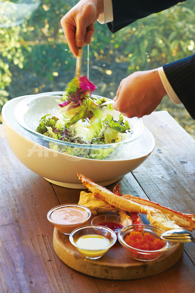 キッチンとの一体感がより食の楽しみを増す1階のシェフズカウンターでは人気のシェアメニューから、特製窯で焼き上げた「キハチの包み焼き」や、目の前で最後の仕上げを披露するサラダはお薦め。一方、さまざまなシーンを演出してくれるフレキシブルな空間設計の2階は、自然を間近に感じられ並木道と心地良いハーモニーを奏でる。