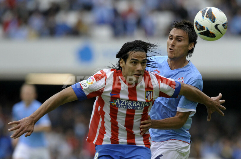 セルタの選手とボールを競るアトレティコ・マドリードのラダメル・ファルカオ・ガルシア(Radamel Falcao Garcia、2013年5月8日撮影)。(c)AFP/MIGUEL RIOPA