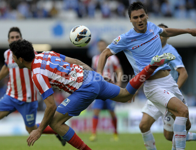 セルタの選手とボールを競るアトレティコ・マドリードのジエゴ・コスタ(Diego da Silva Costa、2013年5月8日撮影)。(c)AFP/MIGUEL RIOPA