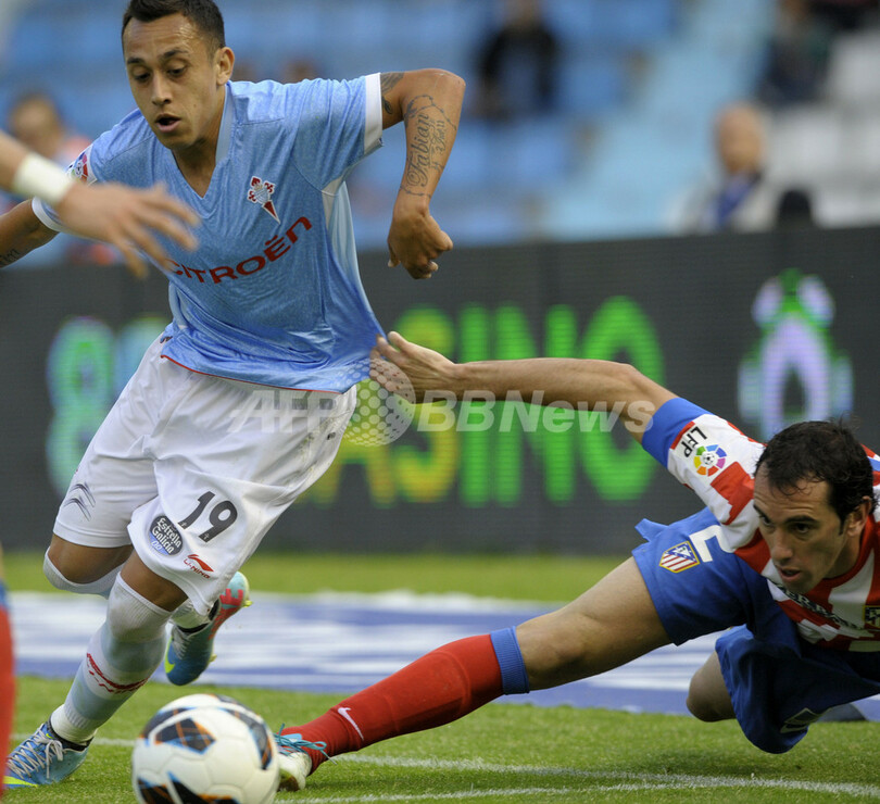 アトレティコ・マドリードのディエゴ・ゴディン(Diego Godin)をかわすセルタのファビアン・オレジャーナ(Fabian Orellana、2013年5月8日撮影)。(c)AFP/MIGUEL RIOPA