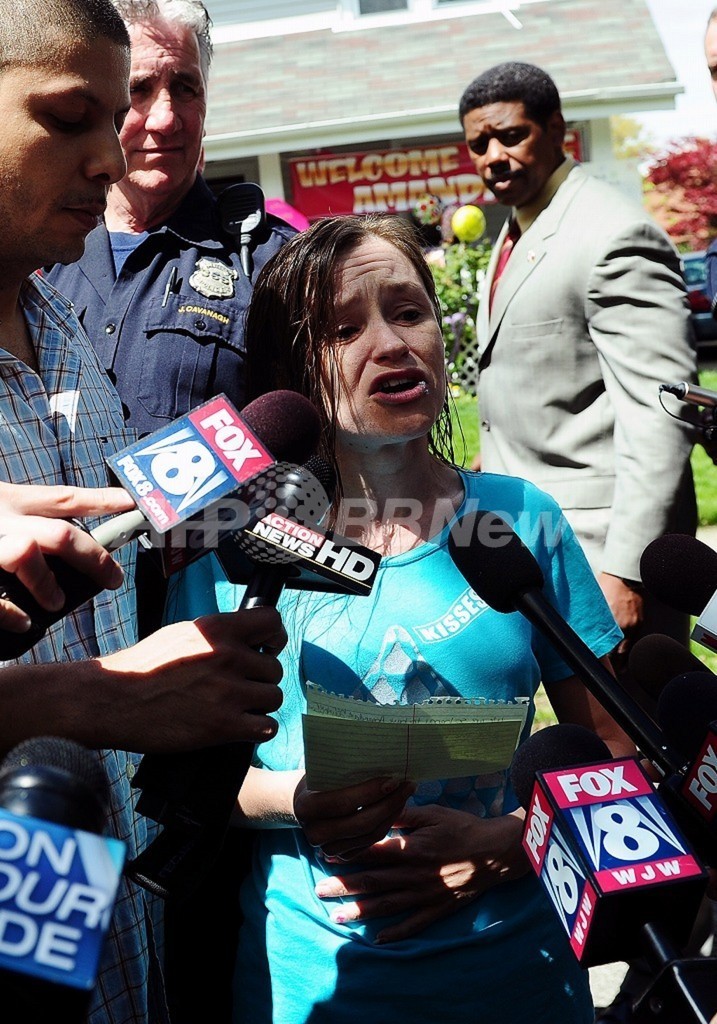 写真は、被害者のアマンダ・ベリー(Amanda Berry)さん(27)の帰還に当たって声明を発表する姉のベス・セラノ(Beth Serrano)さん(2013年5月8日撮影)。(c)AFP/Emmanuel Dunand