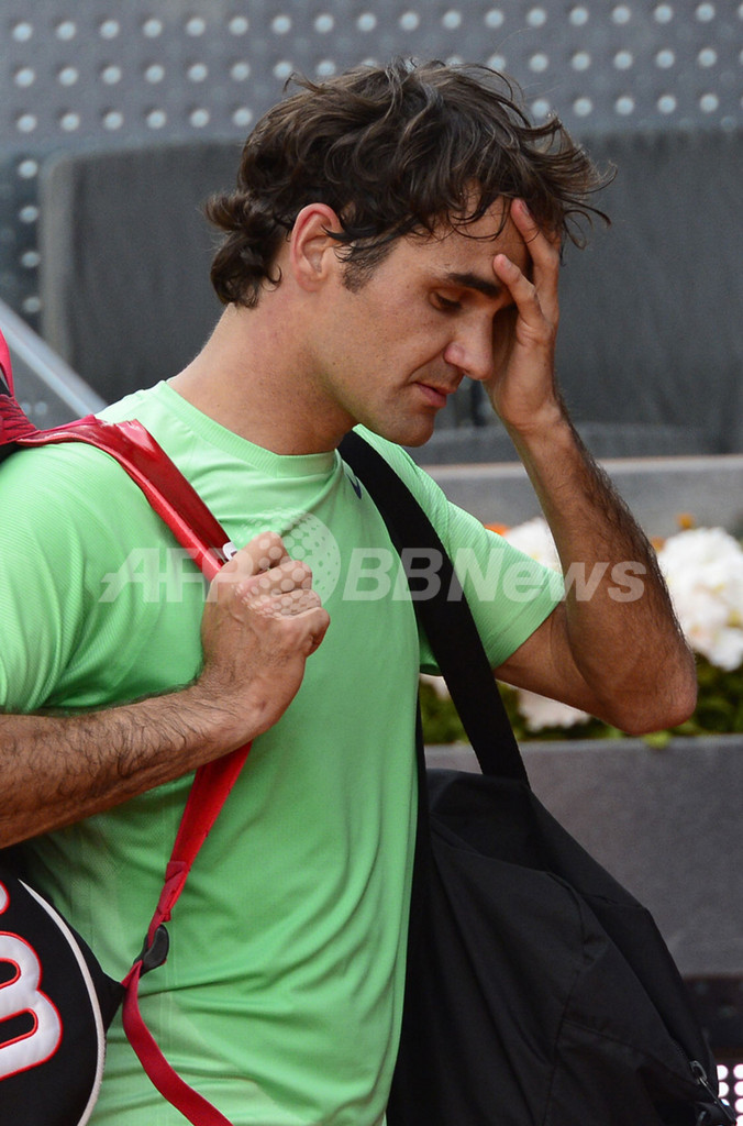 落胆した表情で試合後コートを後にするロジャー・フェデラー(2013年5月9日撮影)。(c)AFP/JAVIER SORIANO