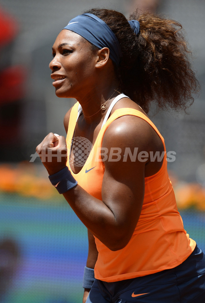ポイントを奪いガッツポーズを見せるセレーナ・ウィリアムス(2013年5月9日撮影)。(c)AFP/PIERRE-PHILIPPE MARCOU