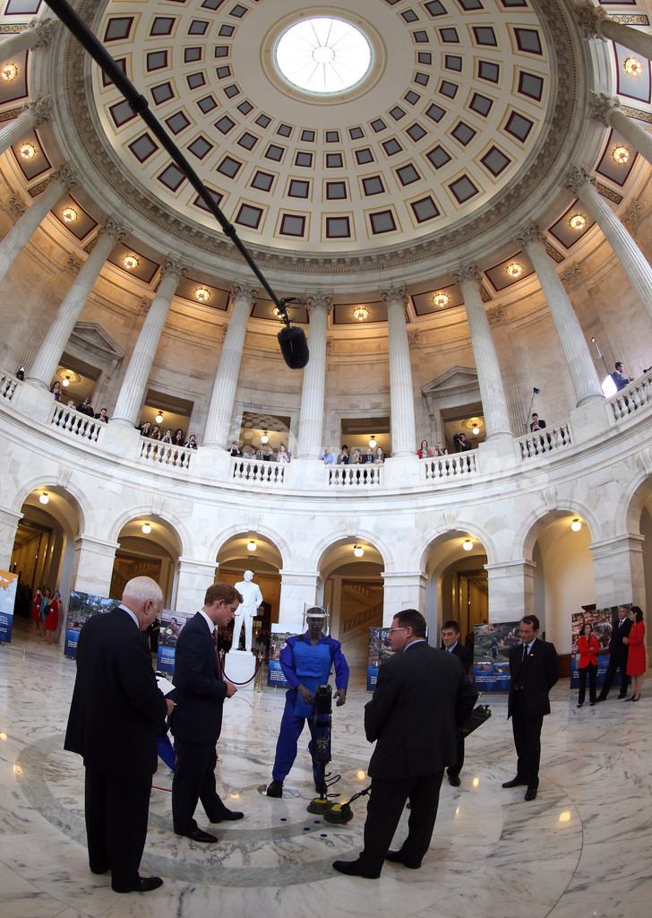 1週間の日程で米国を公式訪問したヘンリー王子は、米国の権力の中枢たる連邦議会議事堂一帯にあるラッセル上院議員会館(Russell Senate Office)で、母親の故ダイアナ元皇太子妃(Princess Diana)が支援していた地雷除去専門NGO「ヘイロー・トラスト(Halo Trust)」の写真展を見学。28歳独身の王子が姿を現すと、悲鳴のような歓声がホールにこだました。