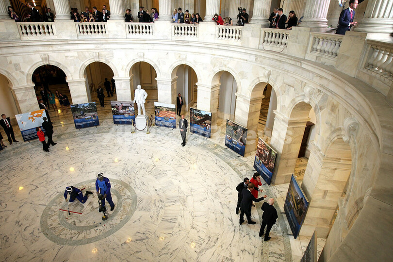 写真はラッセル上院議員会館(Russell Senate Office)で、地雷除去専門NGO「ヘイロー・トラスト(Halo Trust)」の写真展を見学するヘンリー王子一行(右下、2013年5月9日撮影)。(c)AFP/Getty Images/Alex Wong