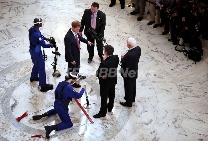 写真はラッセル上院議員会館(Russell Senate Office)で、地雷除去について説明を受けるヘンリー王子一行(2013年5月9日撮影)。(c)AFP/Getty Images/Alex Wong