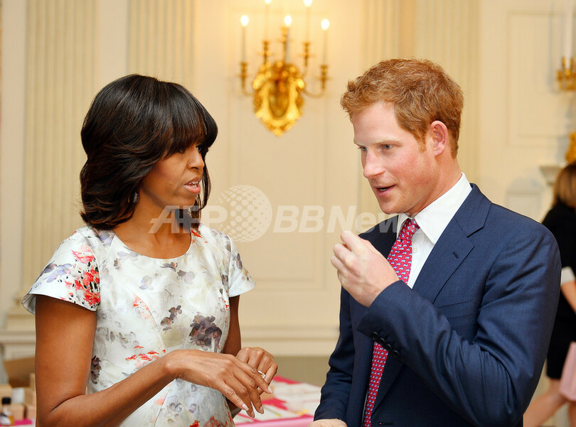 写真は、ミシェル・オバマ(Michelle Obama)米大統領夫人の歓迎を受けるヘンリー王子。王子はホワイトハウスも電撃訪問し、ミシェル夫人のアフタヌーンティーに招かれた(2013年5月9日撮影)。(c)AFP/Getty Images/John Stillwell - WPA Pool