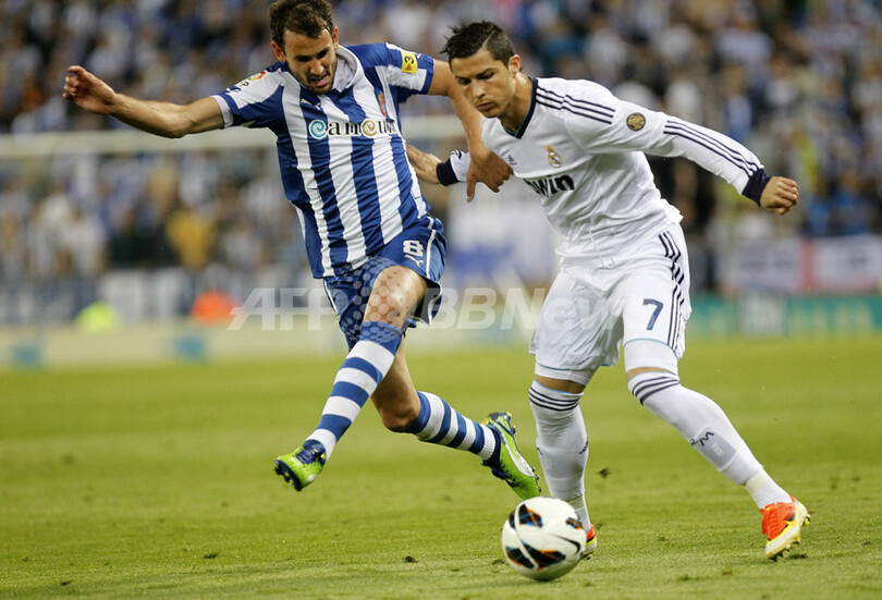 RCDエスパニョールのクリスティアン・ストゥアニ(Christian Stuani、左)とボールを競るレアル・マドリードのクリスティアーノ・ロナウド(Cristiano Ronaldo、2013年5月11日撮影)。(c)AFP/QUIQUE GARCIA