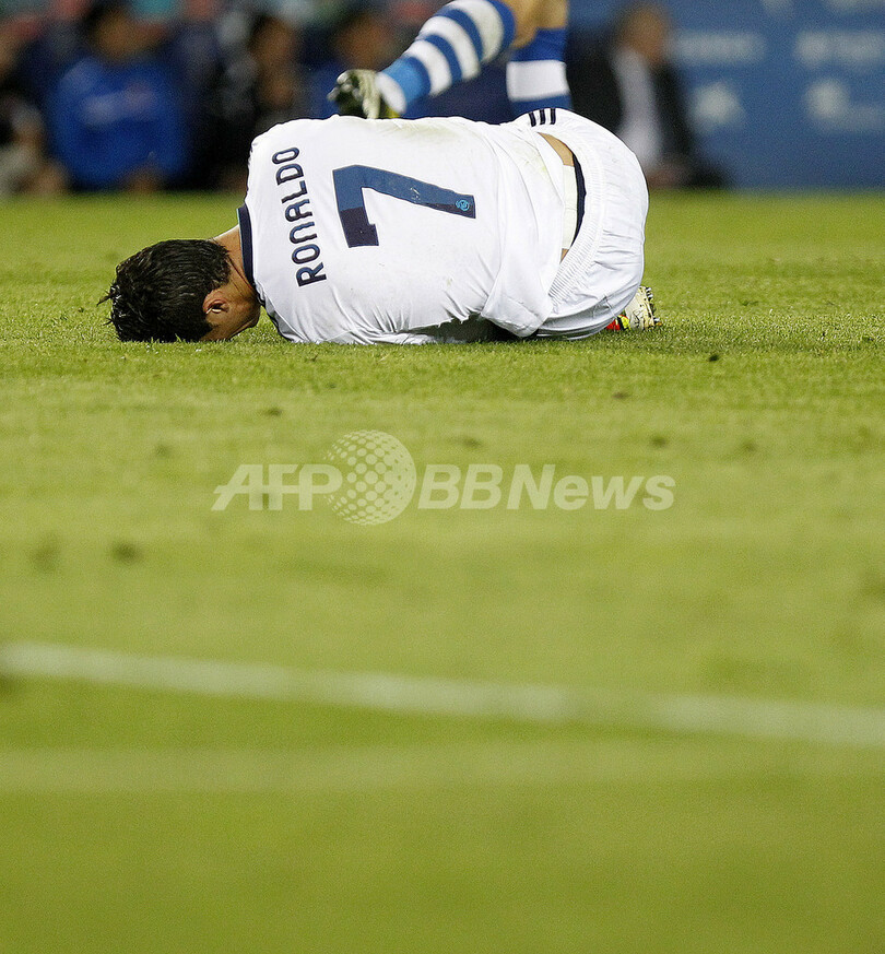 ピッチに倒れ込むレアル・マドリードのクリスティアーノ・ロナウド(Cristiano Ronaldo、2013年5月11日撮影)。(c)AFP/QUIQUE GARCIA