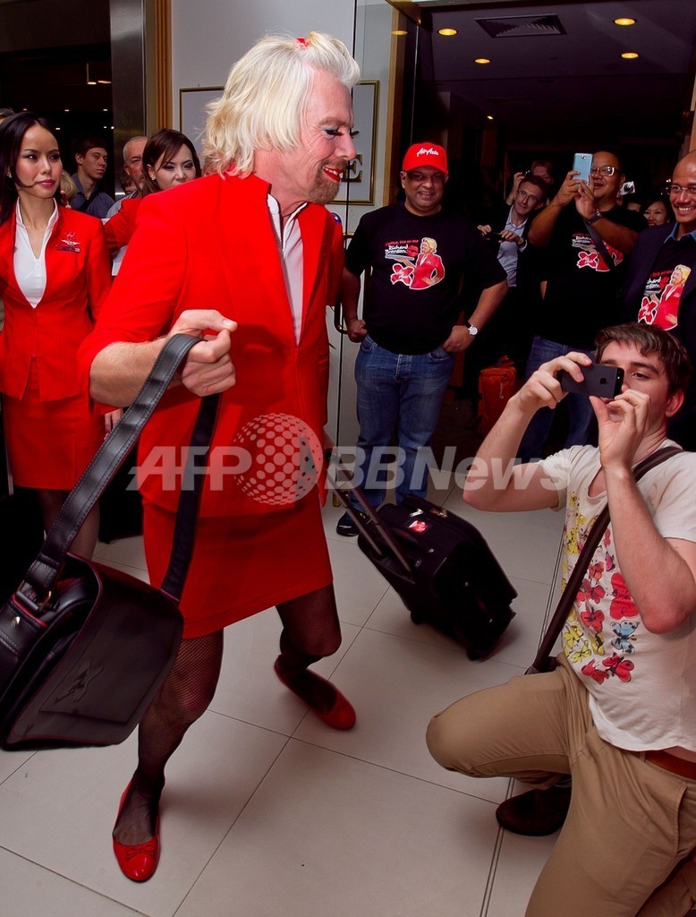 ブランソン会長とエアアジアのトニー・フェルナンデス(Tony Fernandes)最高経営責任者(CEO)はそれぞれ自動車レースF1のチームの元オーナーと現オーナー。2010年シーズンの敗者が勝者の航空会社で客室乗務員になる賭けを行い、最終戦アブダビ(Abu Dhabi)GPでブランソン会長の負けが決定。この日はそれから約2年半後の「罰ゲーム」実行となった。(c)AFP