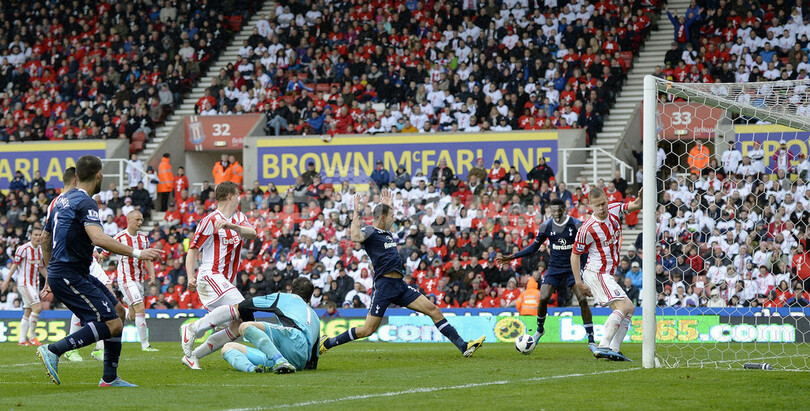 【5月13日 AFP】12-13イングランド・プレミアリーグは12日、第37節の試合が各地で行われ、トッテナム・ホットスパー(Tottenham Hotspur)は2-1でストーク・シティ(Stoke City)に勝利した。