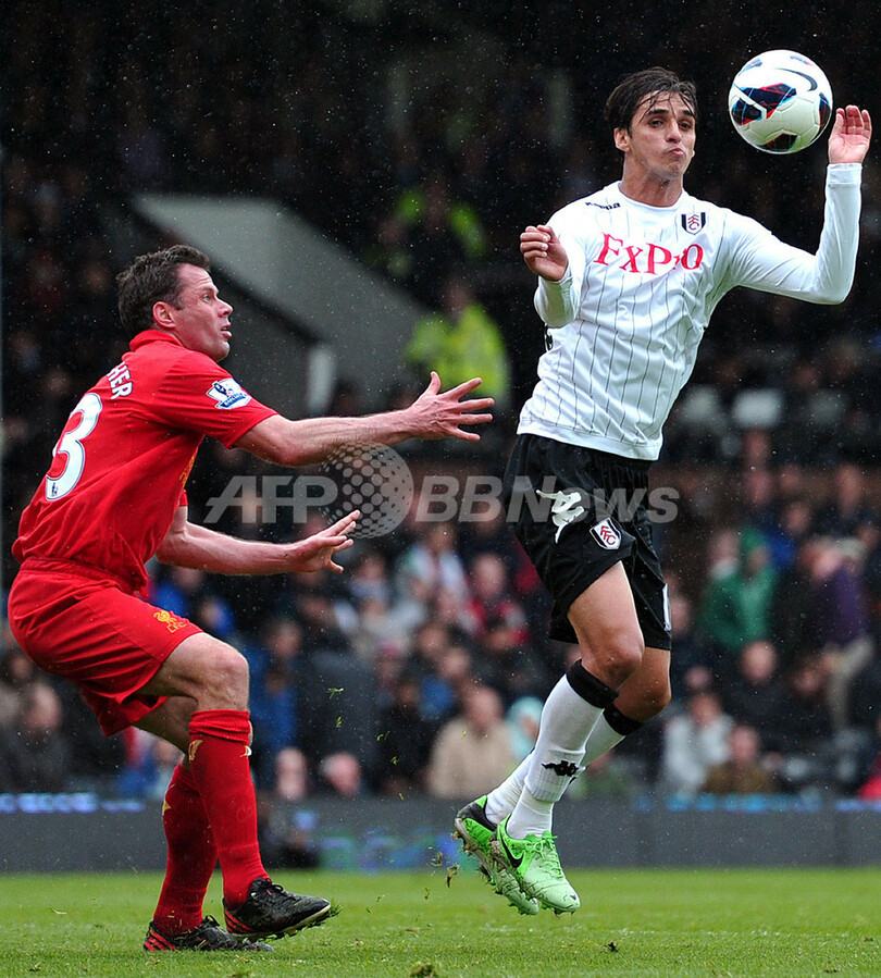 リバプールのジェイミー・キャラガー(Jamie Carragher、左)にマークされながらボールを追うフラムのブライアン・ルイス(Bryan Ruiz、2013年5月12日撮影)。(c)AFP/CARL COURT