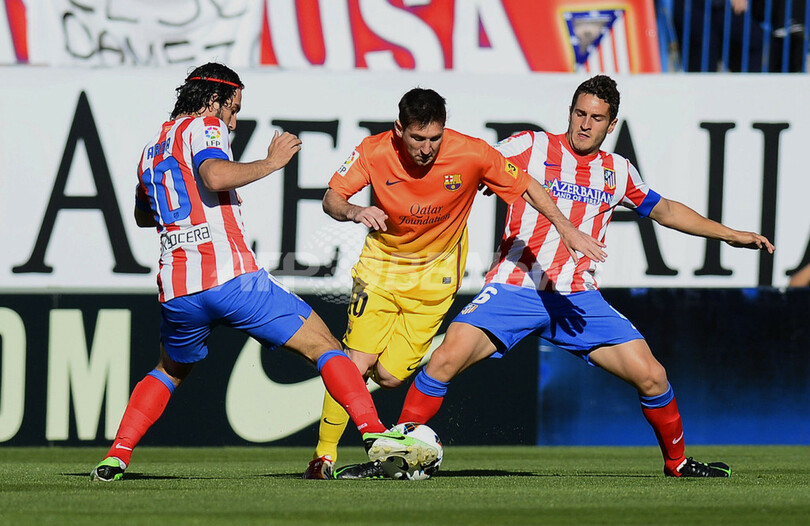 アトレティコ・マドリードのアルダ・トゥラン(Arda Turan、左)とコケ(Jorge Resurreccion Merodio "Koke"、右)に挟まれるFCバルセロナのリオネル・メッシ(Lionel Messi、2013年5月12日撮影)。(c)AFP/PIERRE-PHILIPPE MARCOU