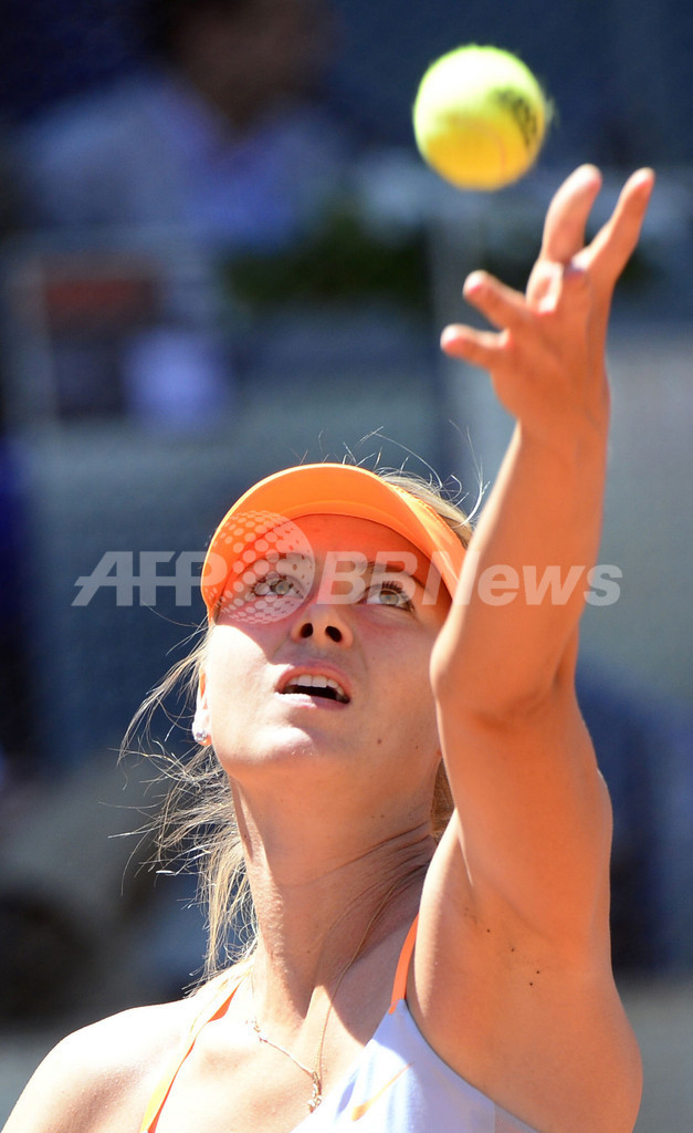 サーブトスを上げるマリア・シャラポワ(2013年5月12日撮影)。(c)AFP/JAVIER SORIANO