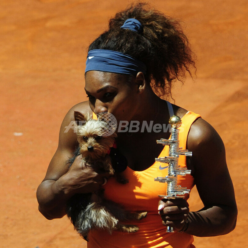 優勝を飾り、愛犬を抱いてトロフィーとともに記念撮影に臨むセレーナ・ウィリアムス(2013年5月12日撮影)。(c)AFP/DOMINIQUE FAGET