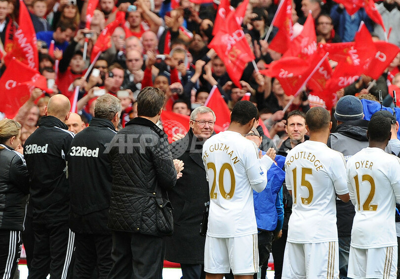 スウォンジー・シティの選手の出迎えを受けるマンチェスター・ユナイテッドのアレックス・ファーガソン(Alex Ferguson)監督(中央、2013年5月12日撮影)。(c)AFP/ANDREW YATES