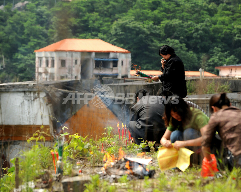 写真は、四川省北川(Beichuan)県で、四川大地震の犠牲者に供え物やろうそくを手向ける住民たち(2013年5月11日撮影)。(c)AFP
