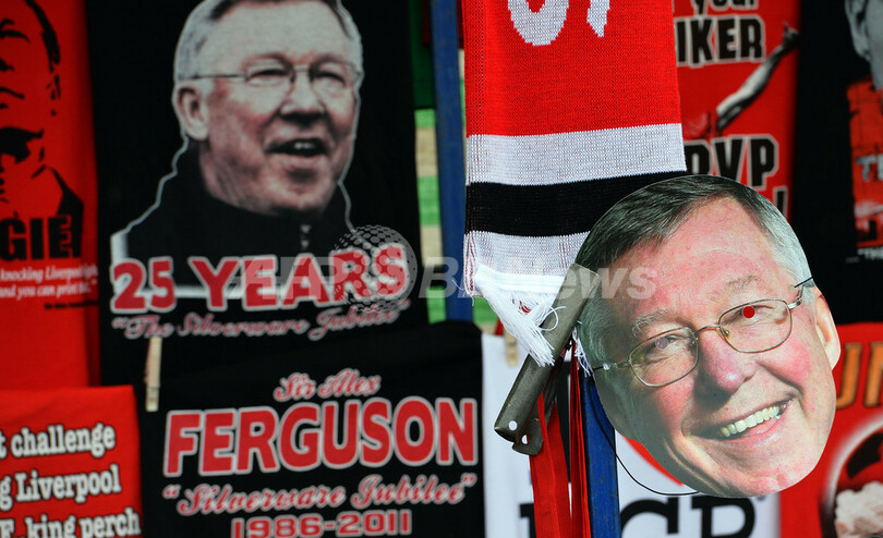 面やTシャツなどのアレックス・ファーガソン監督の関連商品(2013年5月12日撮影)。(c)AFP/PAUL ELLIS