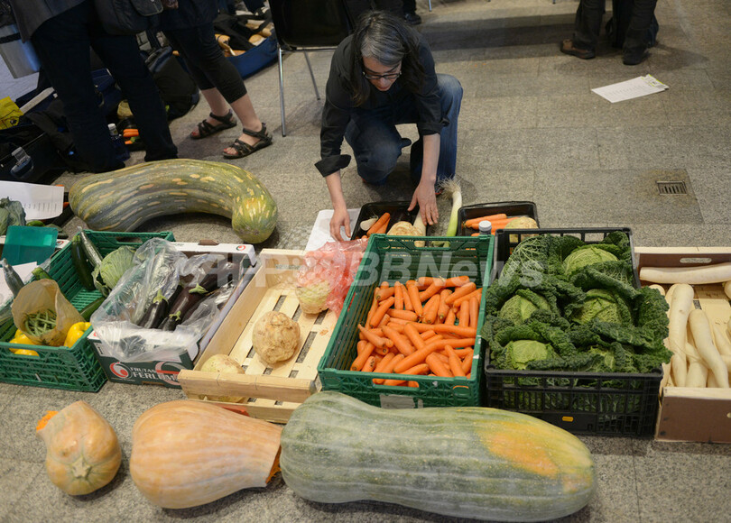 写真は、楽器用の野菜を品定めする楽団員(2013年5月13日撮影)。(c)AFP/DOMINIQUE FAGET