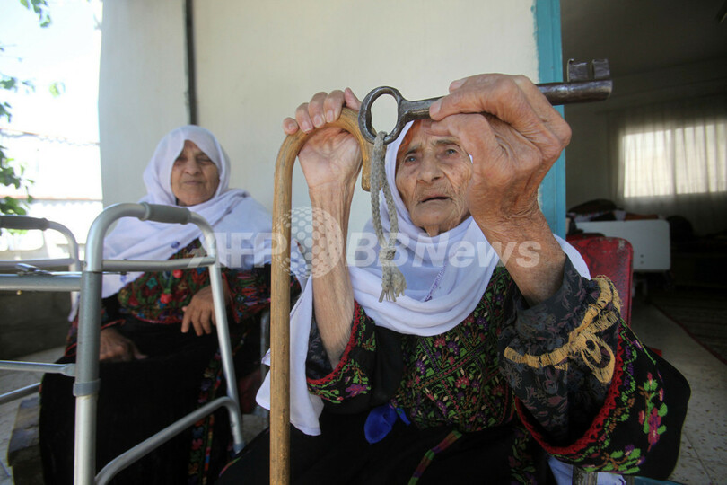 写真はヨルダン川西岸北部ヘブロン(Hebron)にある難民キャンプで、「ナクバ」まで暮らしていた自宅の鍵を見せる102歳の女性(2013年5月14日撮影)。(c)AFP/HAZEM BADER