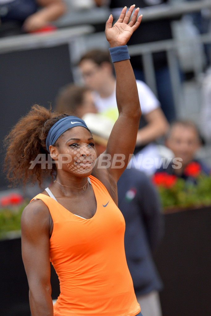 試合に勝利し、歓声に応えるセレーナ・ウィリアムス(2013年5月16日撮影)。(c)AFP/ANDREAS SOLARO