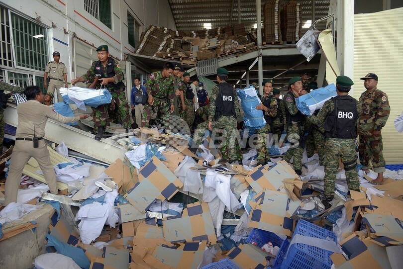 事故現場では、地元救助隊と兵士らががれきに埋まった作業員の救助活動を行った。崩落したのは、運動靴やスニーカーなどの箱が積み上げられていた中二階部分の床とみられる。