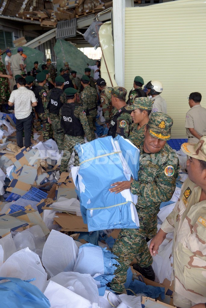 写真は、カンボジア南部コンポンスプー(Kampong Speu)州の靴工場で起きた天井崩落事故の現場で、がれきを撤去する兵士ら(2013年5月16日撮影)(c)AFP/TANG CHHIN SOTHY
