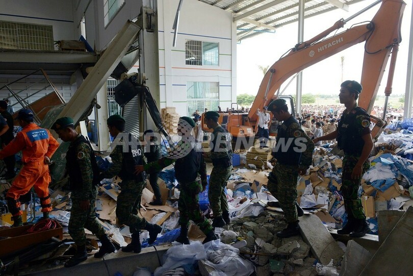 事故現場では、地元救助隊と兵士らががれきに埋まった作業員の救助活動を行った。崩落したのは、運動靴やスニーカーなどの箱が積み上げられていた中二階部分の床とみられる。