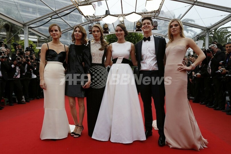 南仏カンヌ(Cannes)で開催中の第66回カンヌ国際映画祭(Cannes Film Festival)で16日、「ある視点」部門に出品されたソフィア・コッポラ(Sofia Coppola)監督作『The Bling Ring』の公式上映が行われた。同作は、2009年、ロサンゼルス(Los Angeles)で10代の若者たちがオーランド・ブルーム(Orlando Bloom)やリンジー・ローハン(Lindsay Lohan)らセレブの自宅を狙って空き巣に入った一連の事件をベースにしている。犯人の1人を演じた英女優エマ・ワトソン(Emma Watson)は「ハリー・ポッター(Harry Potter)」のハーマイオニー(Hermione)役として有名だが、本作で今どきの若者を演じるため、カーダシアン一家やパリス・ヒルトン(Paris Hilton)らが出演するリアリティー番組を何時間も見たという。写真は、レッドカーペットに登場した監督と出演者たち。(左から)ワトソン、コッポラ、タイッサ・ファーミガ(Taissa Farmiga)、ケイティ・チャン(Katie Chang)、イスラエル・ブルサード(Israel Broussard)、クレア・ジュリアン(Claire Julien、2013年5月16日撮影)。(c)AFP/VALERY HACHE