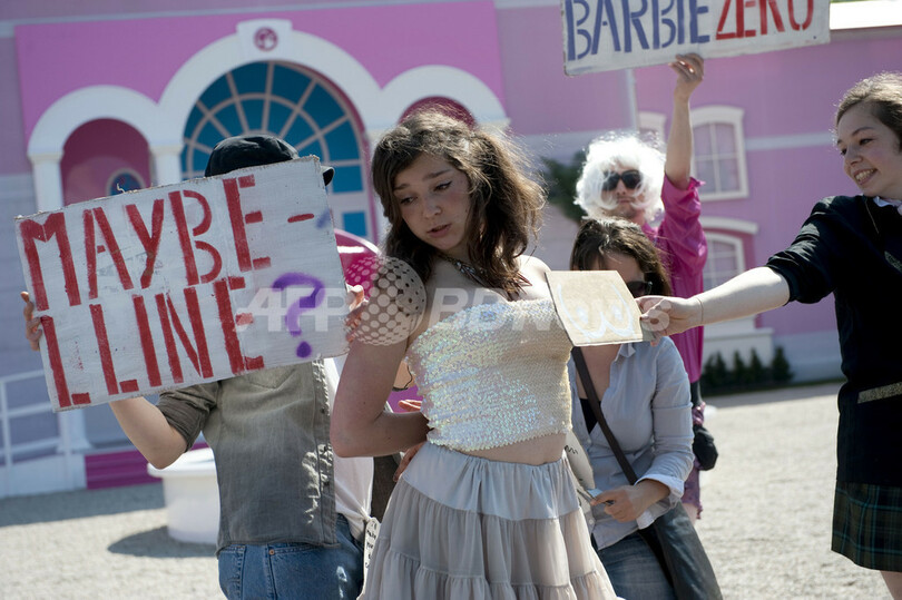 一方、ハウス前には同日、「バービーは性差別主義の象徴だ」と批判する活動家が集まり、抗議デモを繰り広げた。女性権利団体「FEMEN」のメンバーは、ハウス前の広場に飾られた巨大なハイヒール型の噴水に入り、バービー人形を十字架にくくりつけて燃やすなどしてトップレスで抗議した。(c)AFP