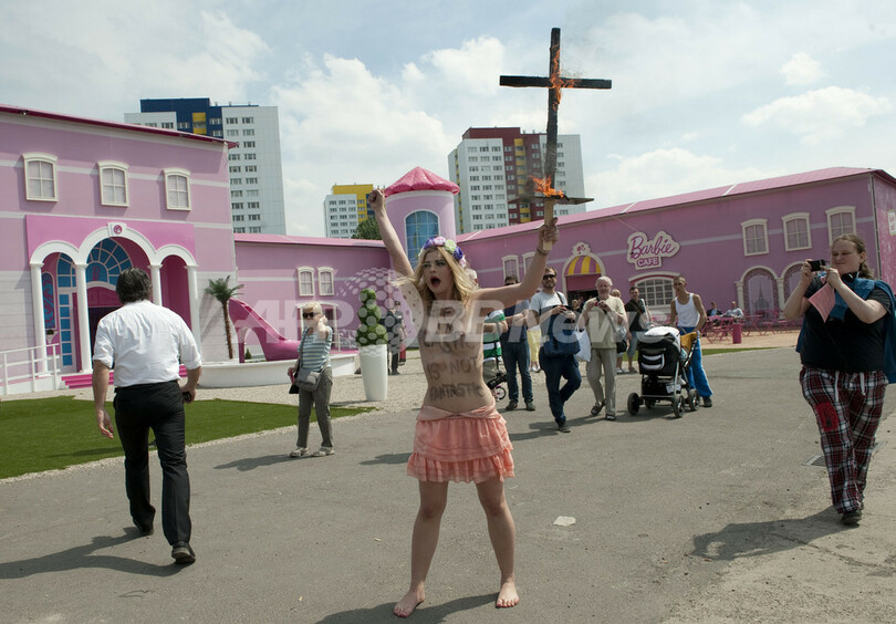 一方、ハウス前には同日、「バービーは性差別主義の象徴だ」と批判する活動家が集まり、抗議デモを繰り広げた。女性権利団体「FEMEN」のメンバーは、ハウス前の広場に飾られた巨大なハイヒール型の噴水に入り、バービー人形を十字架にくくりつけて燃やすなどしてトップレスで抗議した。(c)AFP