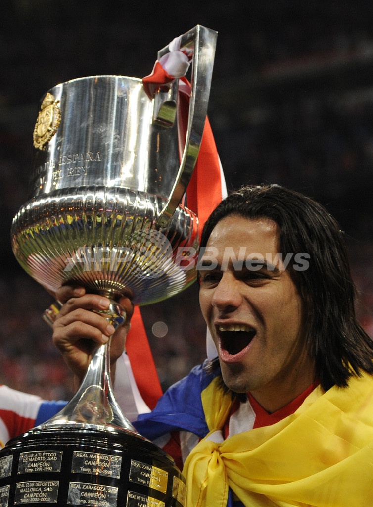 優勝トロフィーを手に歓喜するアトレティコ・マドリードのラダメル・ファルカオ・ガルシア(Radamel Falcao Garcia、2013年5月17日撮影)。(c)AFP/DANI POZO