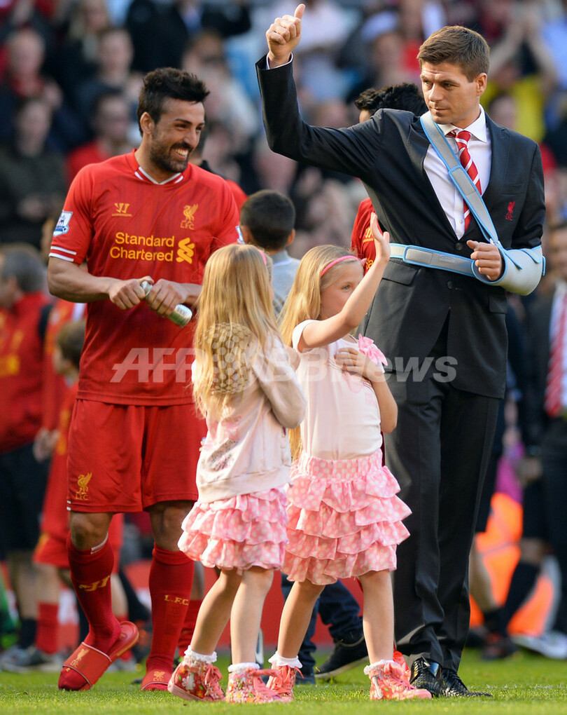 試合後にピッチを回るリバプールのスティーブン・ジェラード(Steven Gerrard、右、2013年5月19日撮影)。(c)AFP/PAUL ELLIS