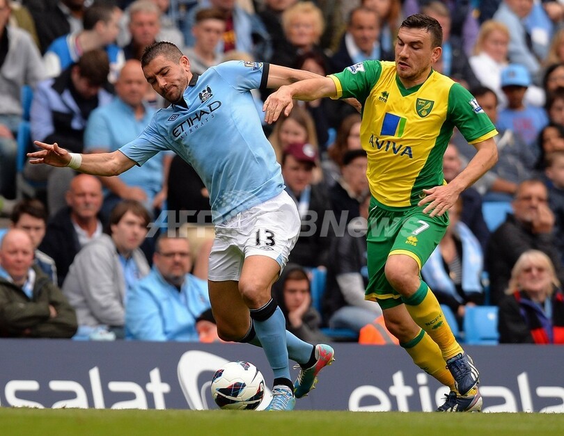 ボールを競るノリッジ・シティのロバート・スノドグラス(Robert Snodgrass、右)とマンチェスター・シティのアレクサンダル・コラロフ(Aleksandar Kolarov、2013年5月19日撮影)。(c)AFP/ANDREW YATES